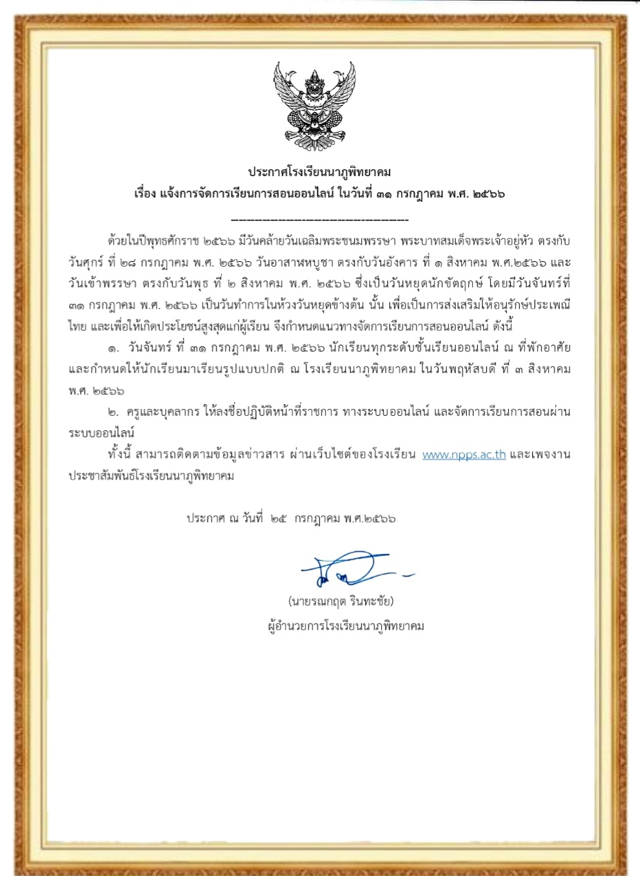 ประกาศแจ้งกำหนดการ ตัดการเรียนในวันที่ 31 กรกฎาคม 2566