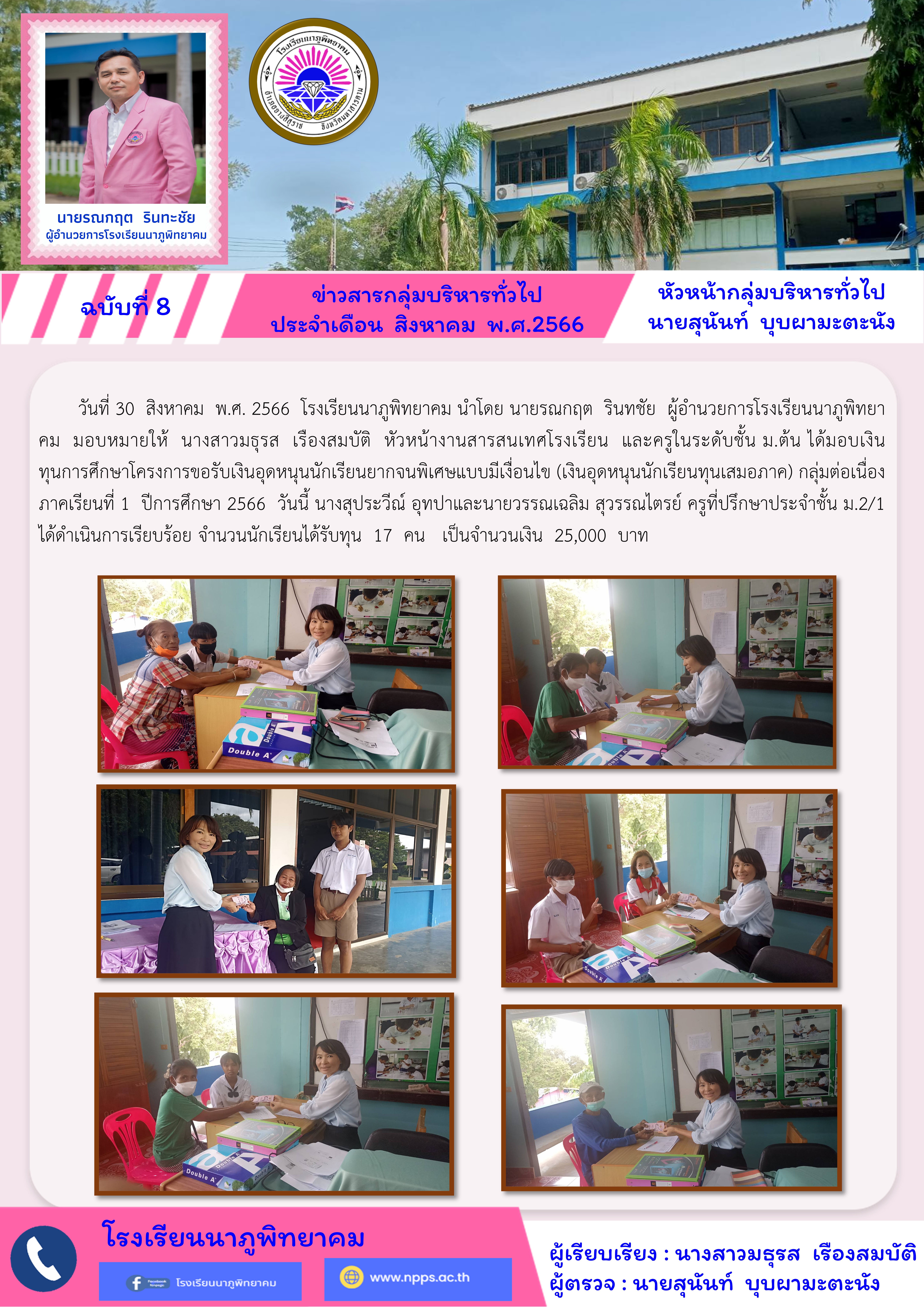 โรงเรียนนาภูพิทยาคมมอบเงินทุนการศึกษาโครงการขอรับเงินอุดหนุนนักเรียนยากจนพิเศษ แบบมีเงื่อนไข(เงินอุดหนุนนักเรียนทุนเสมอภาค) ภาคเรียนที่ 1 ปีการศึกษา 2566 โดยครูที่ปรึกษาประจำชั้น ม. 2/1