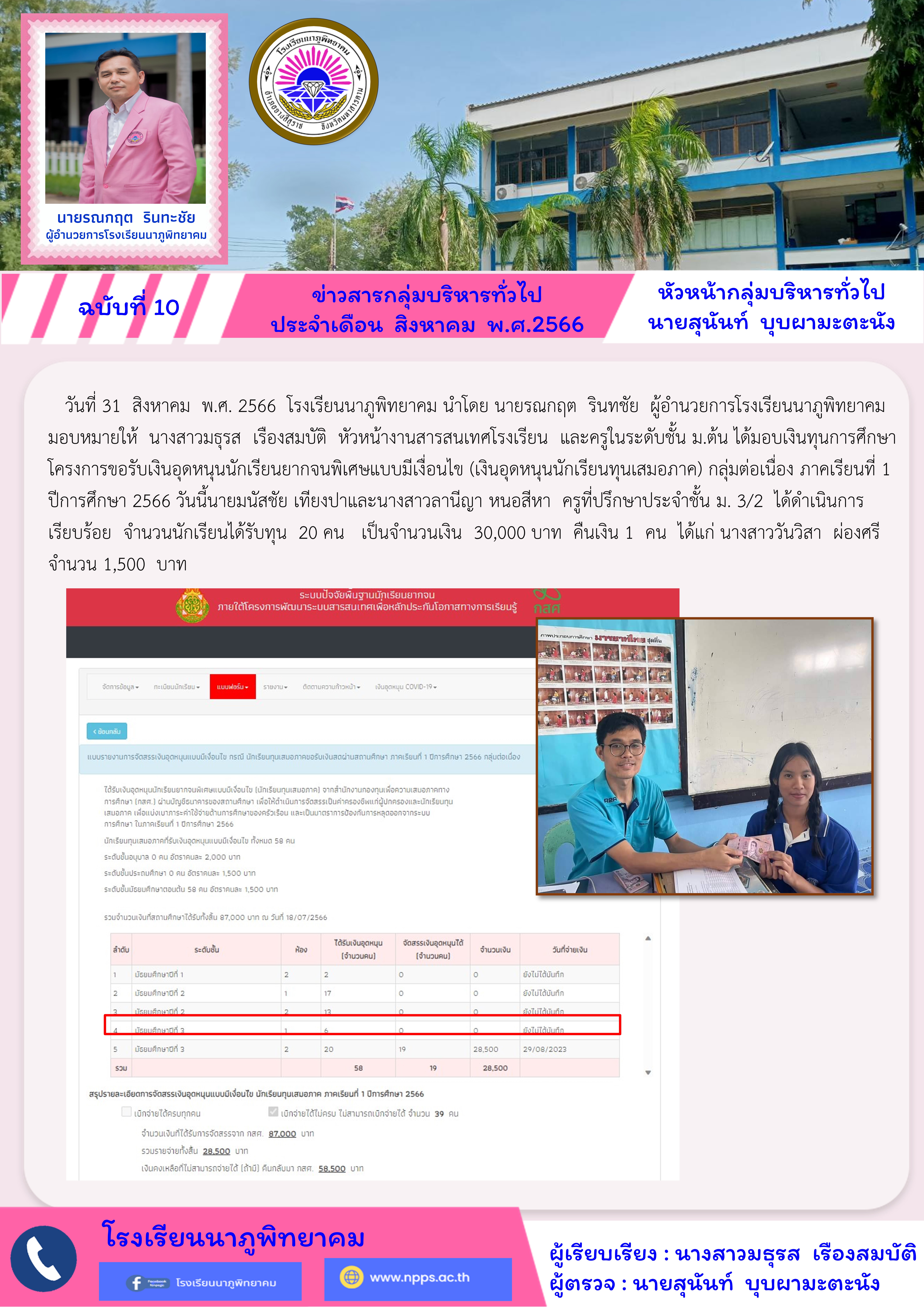 โรงเรียนนาภูพิทยาคมมอบเงินทุนการศึกษาโครงการขอรับเงินอุดหนุนนักเรียนยากจนพิเศษ แบบมีเงื่อนไข(เงินอุดหนุนนักเรียนทุนเสมอภาค) ภาคเรียนที่ 1 ปีการศึกษา 2566 โดยครูที่ปรึกษาประจำชั้น ม. 3/2