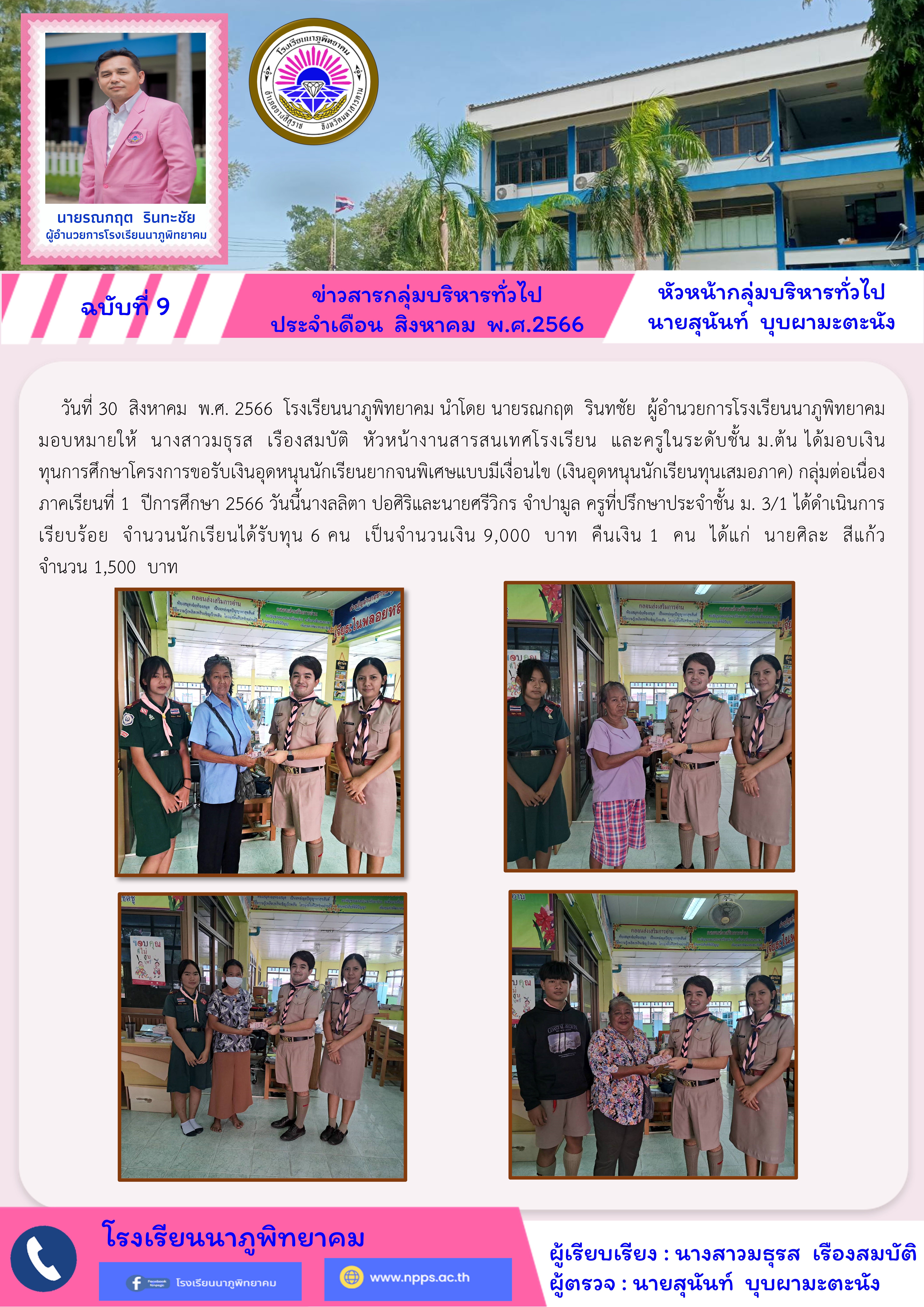 โรงเรียนนาภูพิทยาคมมอบเงินทุนการศึกษาโครงการขอรับเงินอุดหนุนนักเรียนยากจนพิเศษ แบบมีเงื่อนไข(เงินอุดหนุนนักเรียนทุนเสมอภาค) ภาคเรียนที่ 1 ปีการศึกษา 2566 โดยครูที่ปรึกษาประจำชั้น ม. 3/1