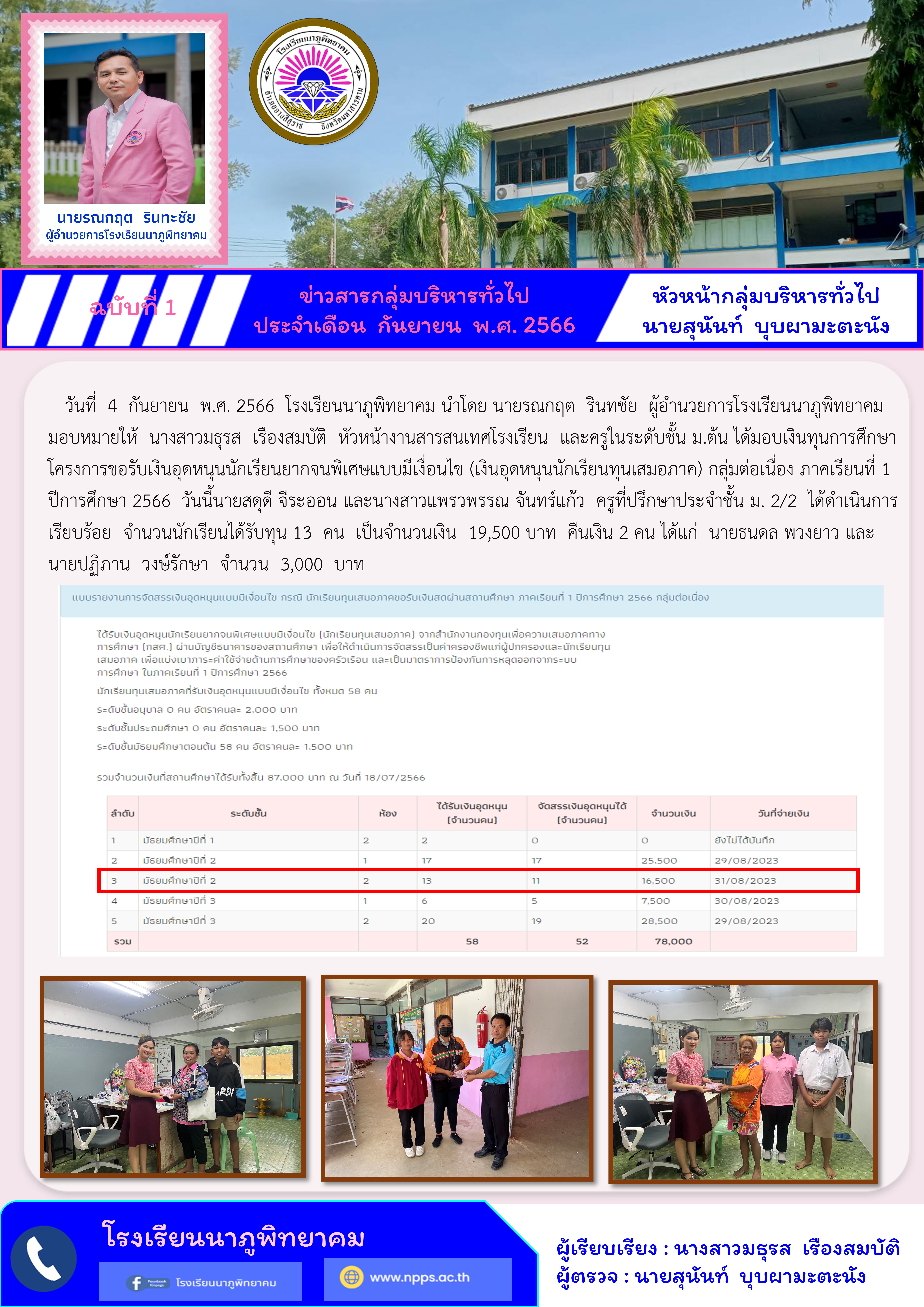 โรงเรียนนาภูพิทยาคมมอบเงินทุนการศึกษาโครงการขอรับเงินอุดหนุนนักเรียนยากจนพิเศษ แบบมีเงื่อนไข(เงินอุดหนุนนักเรียนทุนเสมอภาค) ภาคเรียนที่ 1 ปีการศึกษา 2566 โดยครูที่ปรึกษาประจำชั้น ม. 2/2