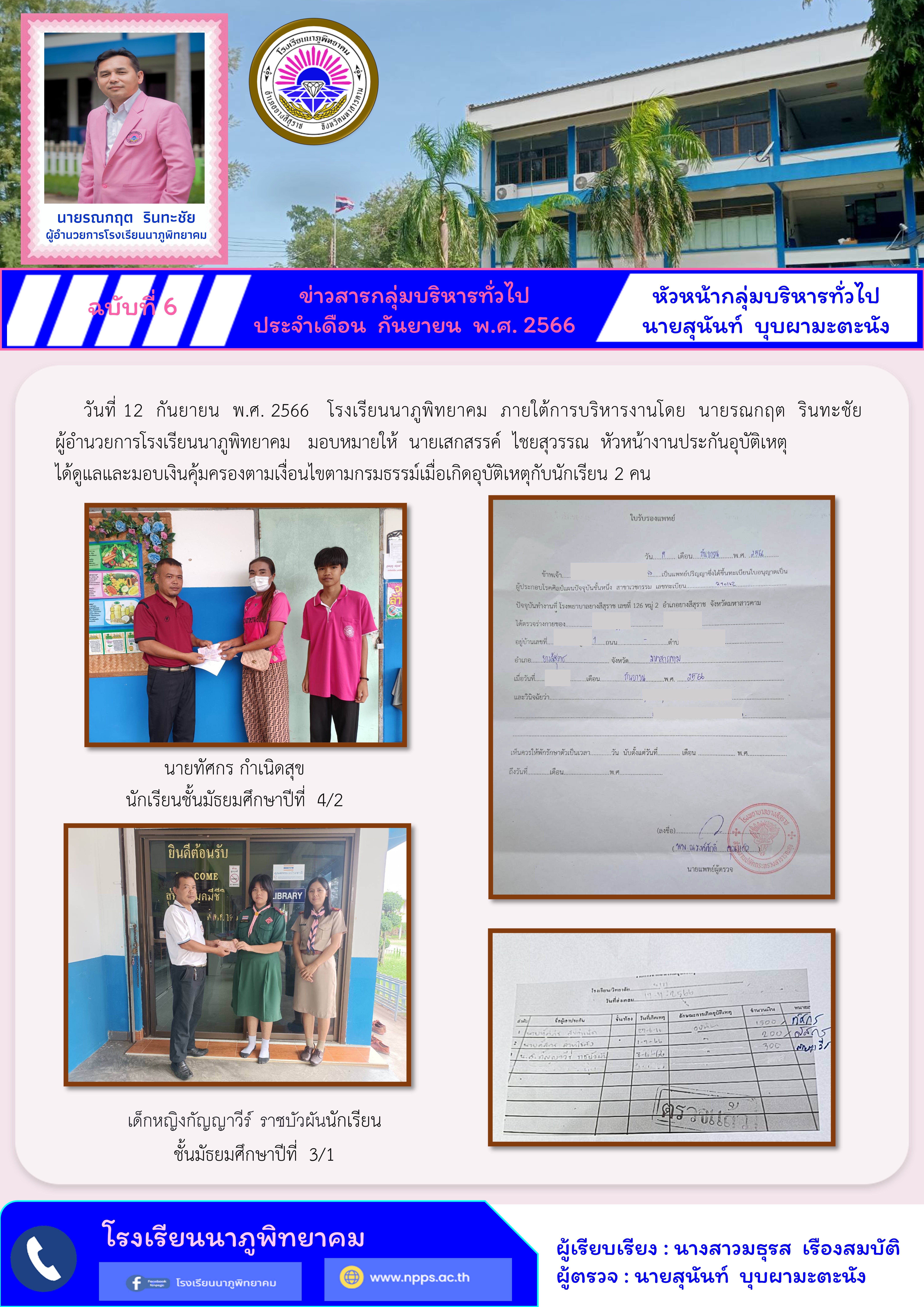 โรงเรียนนาภูพิทยาคม ได้ดูแลและมอบเงินคุ้มครองตามเงื่อนไขตามกรมธรรม์เมื่อเกิดอุบัติเหตุกับนักเรียน