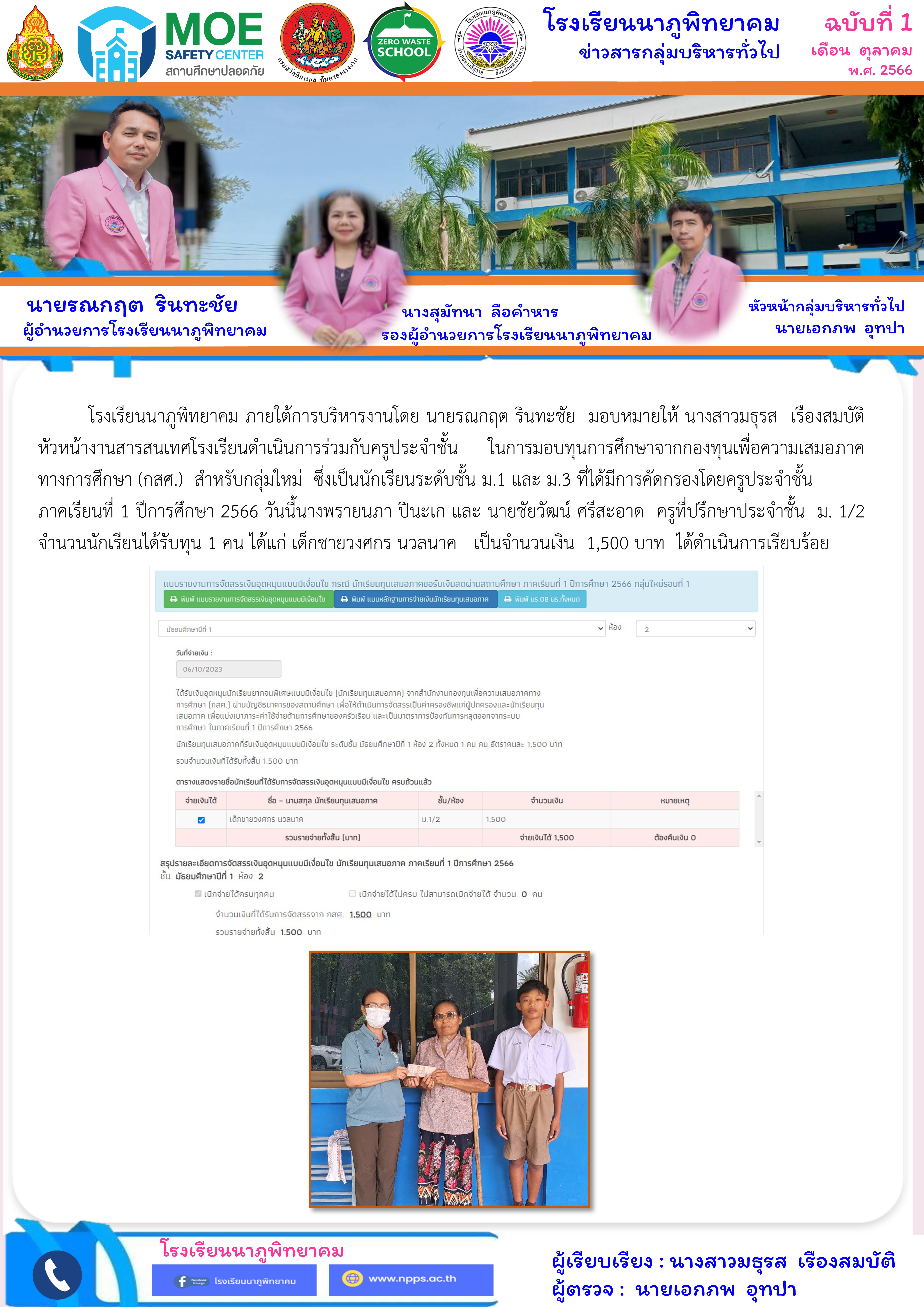 โรงเรียนนาภูพิทยาคมมอบเงินทุนการศึกษาโครงการขอรับเงินอุดหนุนนักเรียนยากจนพิเศษแบบมีเงื่อนไข(เงินอุดหนุนนักเรียนทุนเสมอภาค) กลุ่มใหม่ ภาคเรียนที่ 1 ปีการศึกษา 2566 โดยครูที่ปรึกษาประจำชั้น ม. 1/2