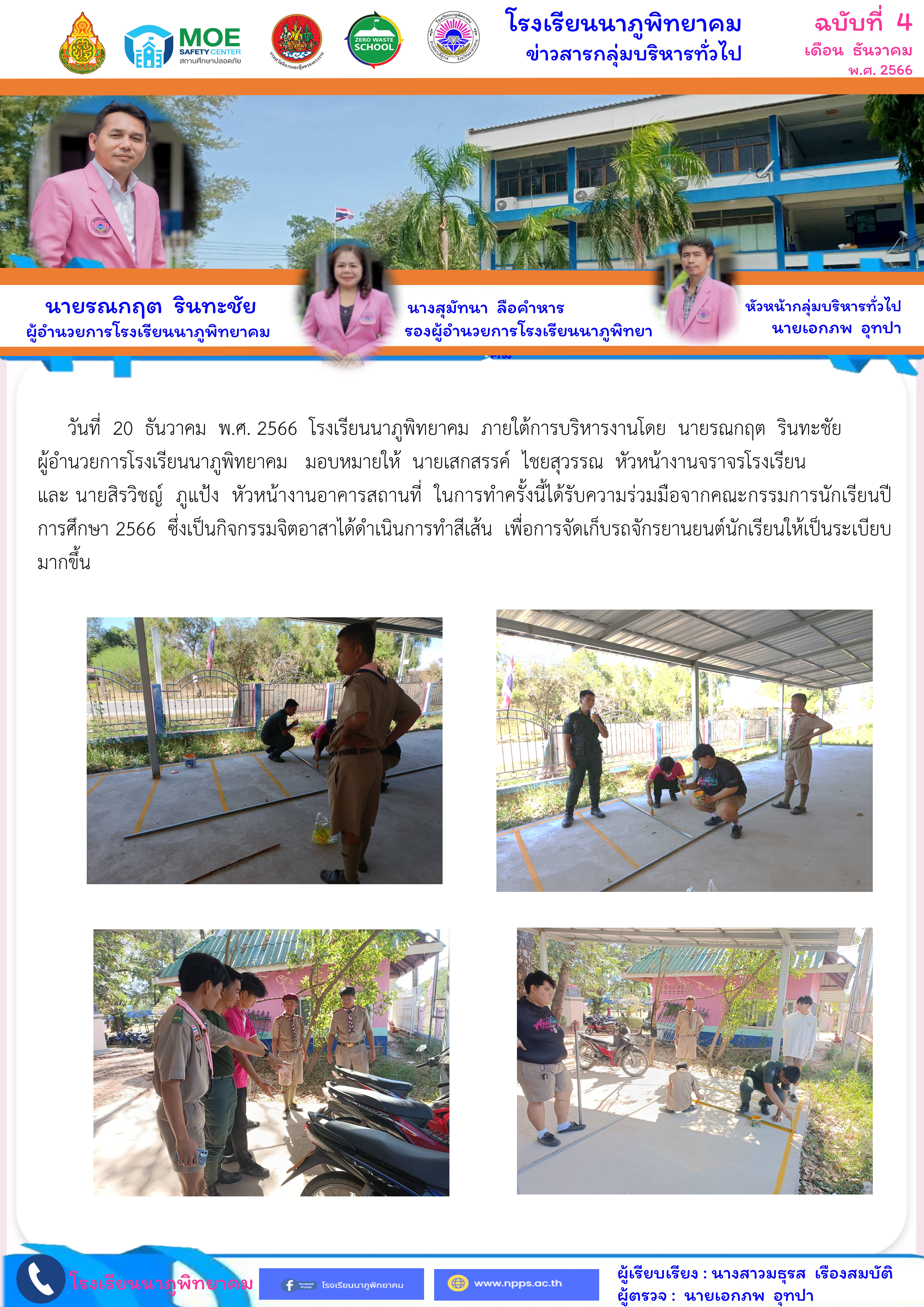 โรงเรียนนาภูพิทยาคม โดยงานจราจรโรงเรียน งานอาคารสถานที่ คณะกรรมการนักเรียนปีการศึกษา 2566 กิจกรรมจิตอาสา ได้ดำเนินการทำสีเส้น เพื่อการจัดเก็บรถจักรยานยนต์นักเรียนให้เป็นระเบียบมากขึ้น