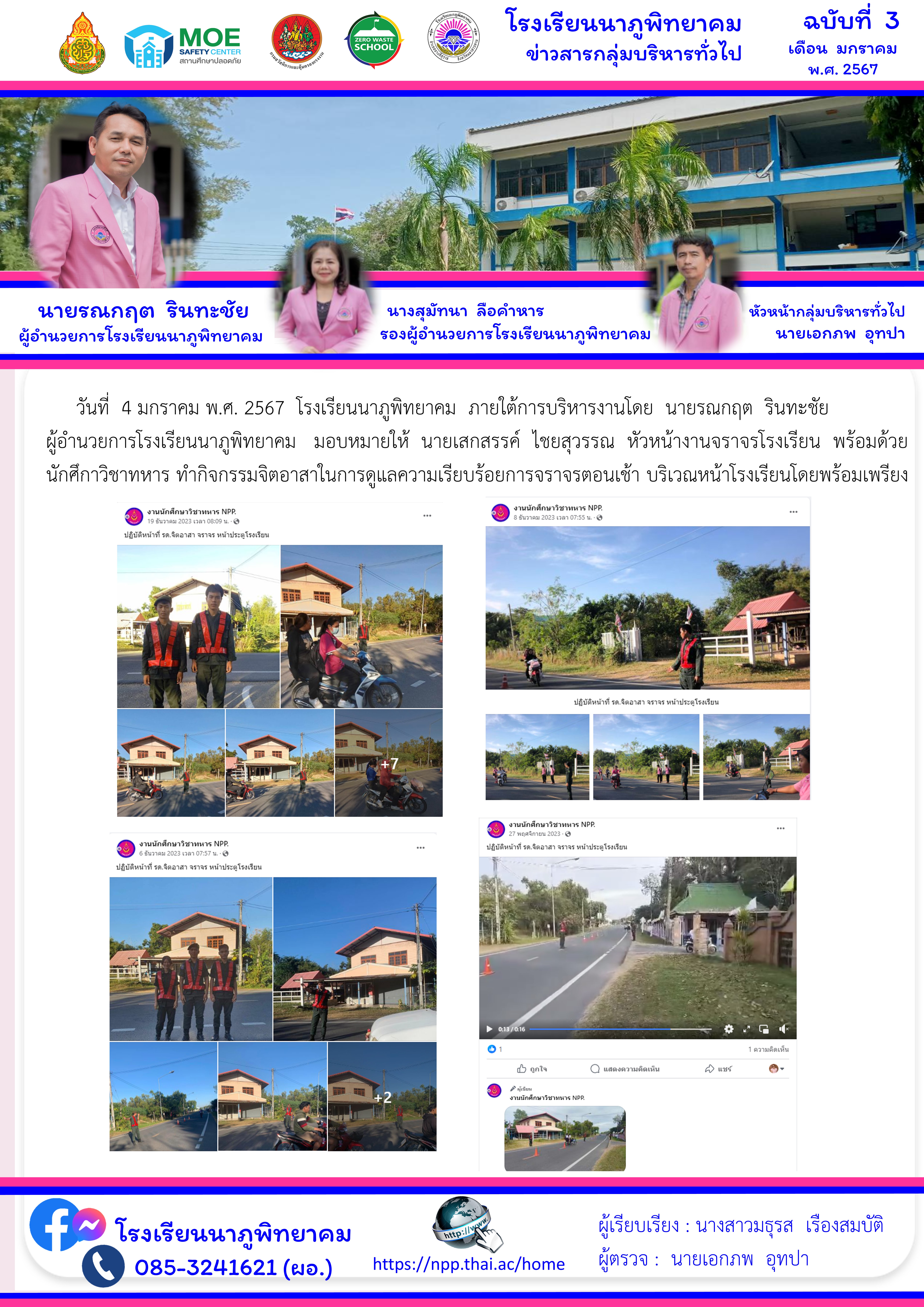 โรงเรียนนาภูพิทยาคมได้มอบหมายให้งานจราจรและนักศึกาวิชาทหาร ทำกิจกรรมจิตอาสาในการดูแลความเรียบร้อยการจราจรตอนเช้า บริเวณหน้าโรงเรียนโดยพร้อมเพรียง