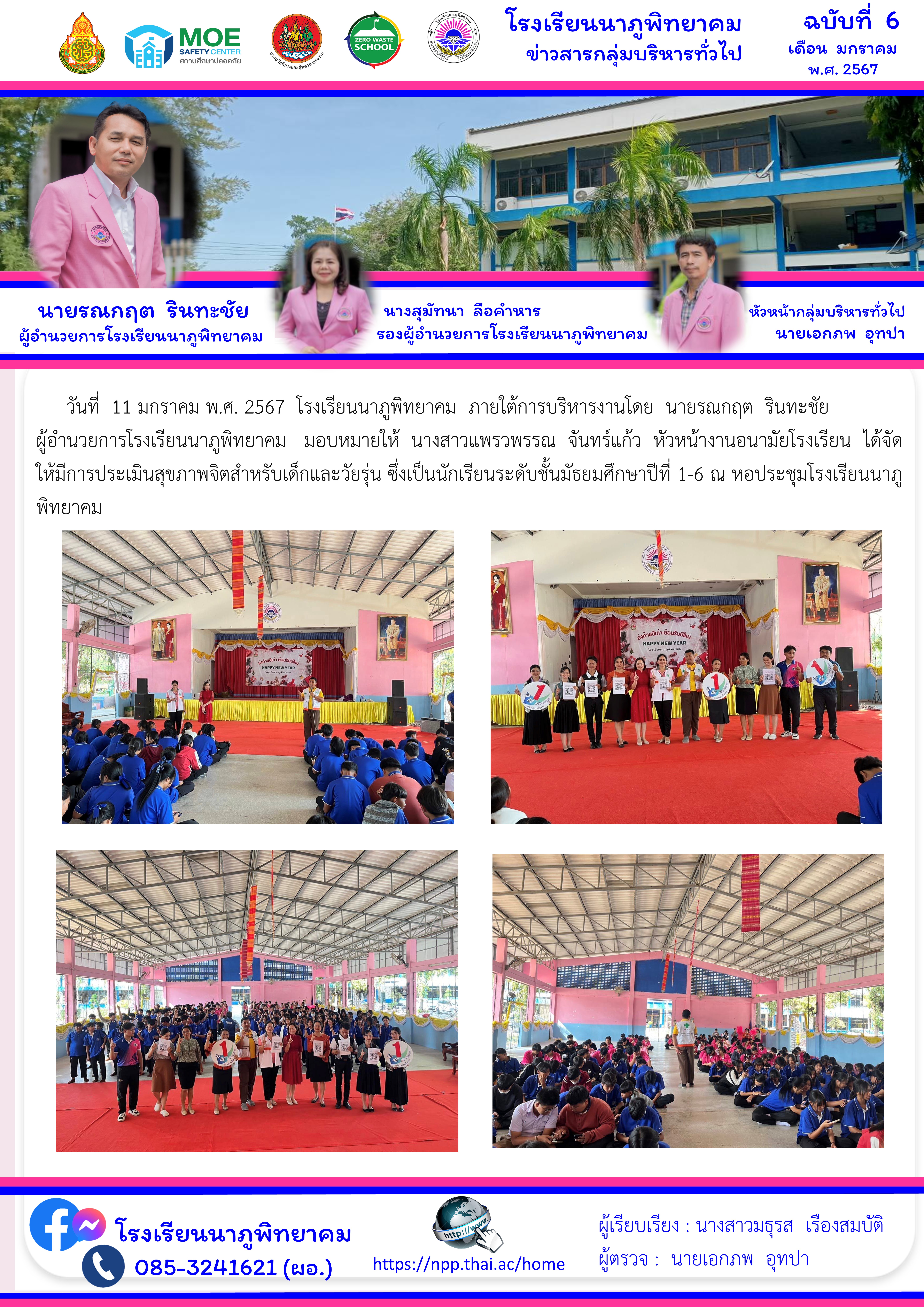 โรงเรียนนาภูพิทยาคม มีกิจกรรมให้ความรู้เกี่ยวกับสุขภาพจิต สำหรับ ม.1 - ม.6 เพื่อประโยชน์ต่อพ่อแม่และผู้ปกครองที่มีบุตรหลานเป็นวัยรุ่น เพื่อการสังเกตอาการเบื้องต้น และนำไปสู่การช่วยเหลือได้อย่างรวดเร็