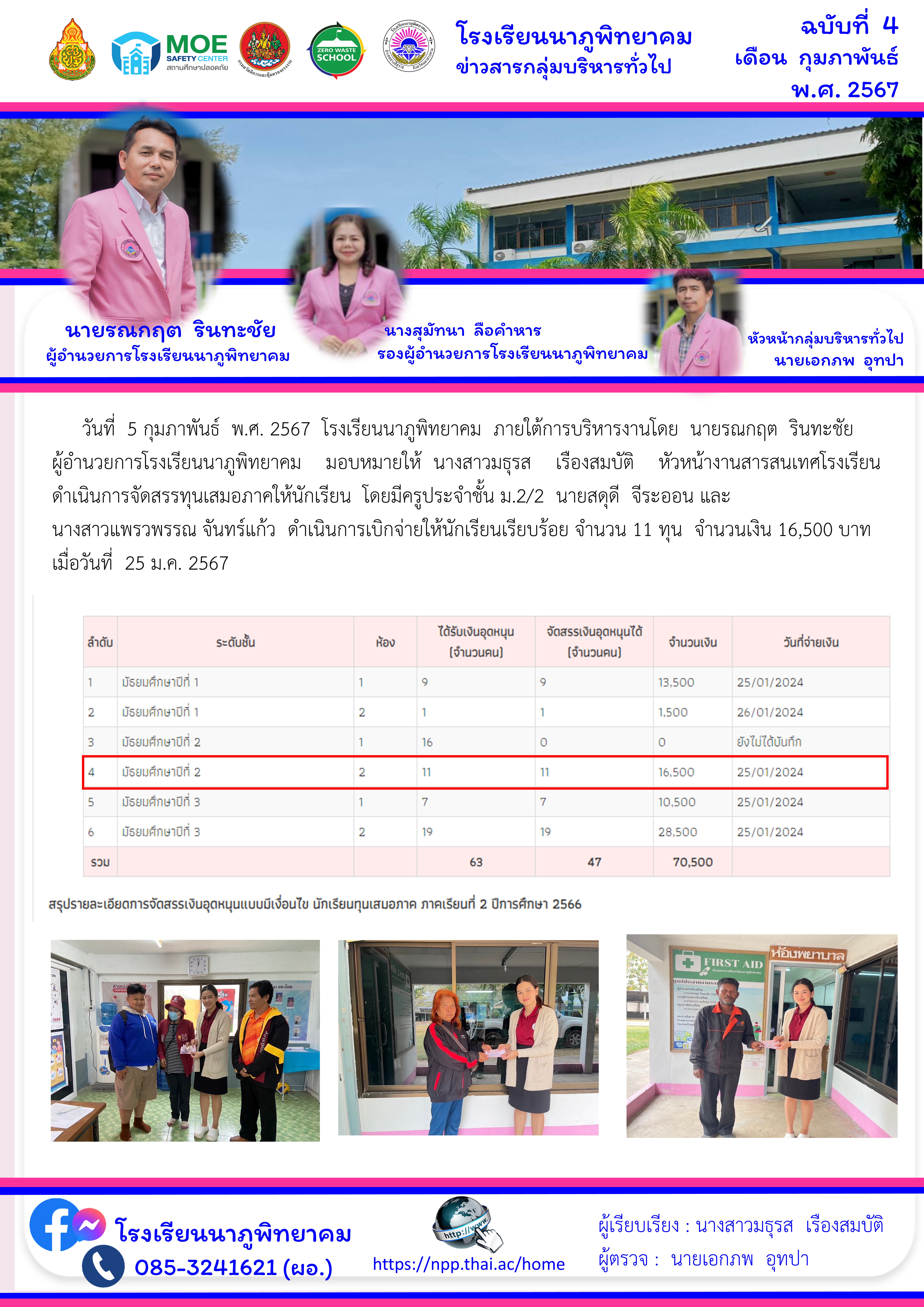 โรงเรียนนาภูพิทยาคม ดำเนินการจัดสรรทุนเสมอภาคให้นักเรียน โดยมีครูประจำชั้น ม.2/2 นายสดุดี จีระออน และ นางสาวแพรวพรรณ จันทร์แก้ว ดำเนินการเบิกจ่ายให้นักเรียนเรียบร้อย