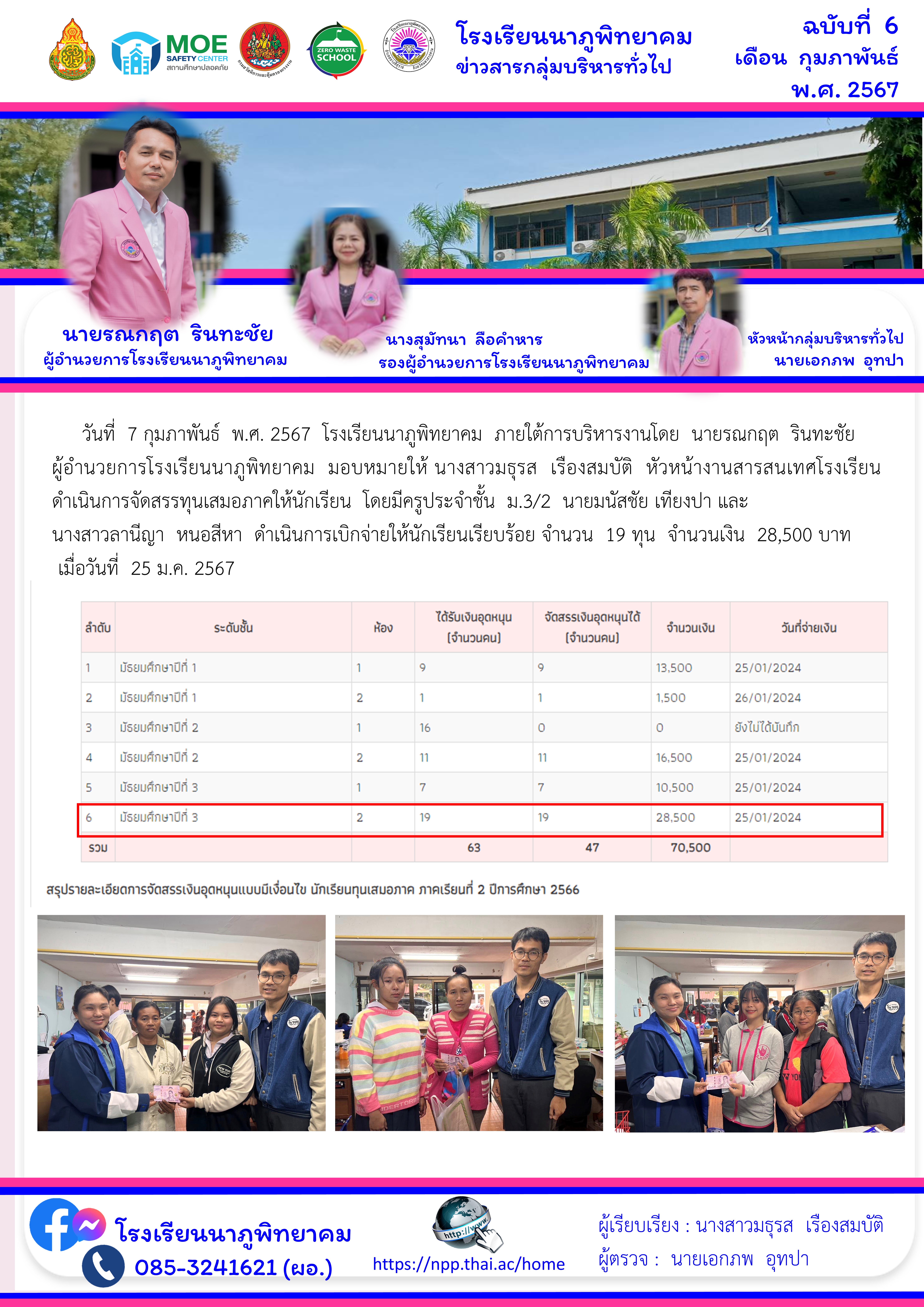 โรงเรียนนาภูพิทยาคม ดำเนินการจัดสรรทุนเสมอภาคให้นักเรียน โดยมีครูประจำชั้น ม.3/2 นายมนัสชัย เทียงปา และ นางสาวลานีญา หนอสีหา ดำเนินการเบิกจ่ายให้นักเรียนเรียบร้อย