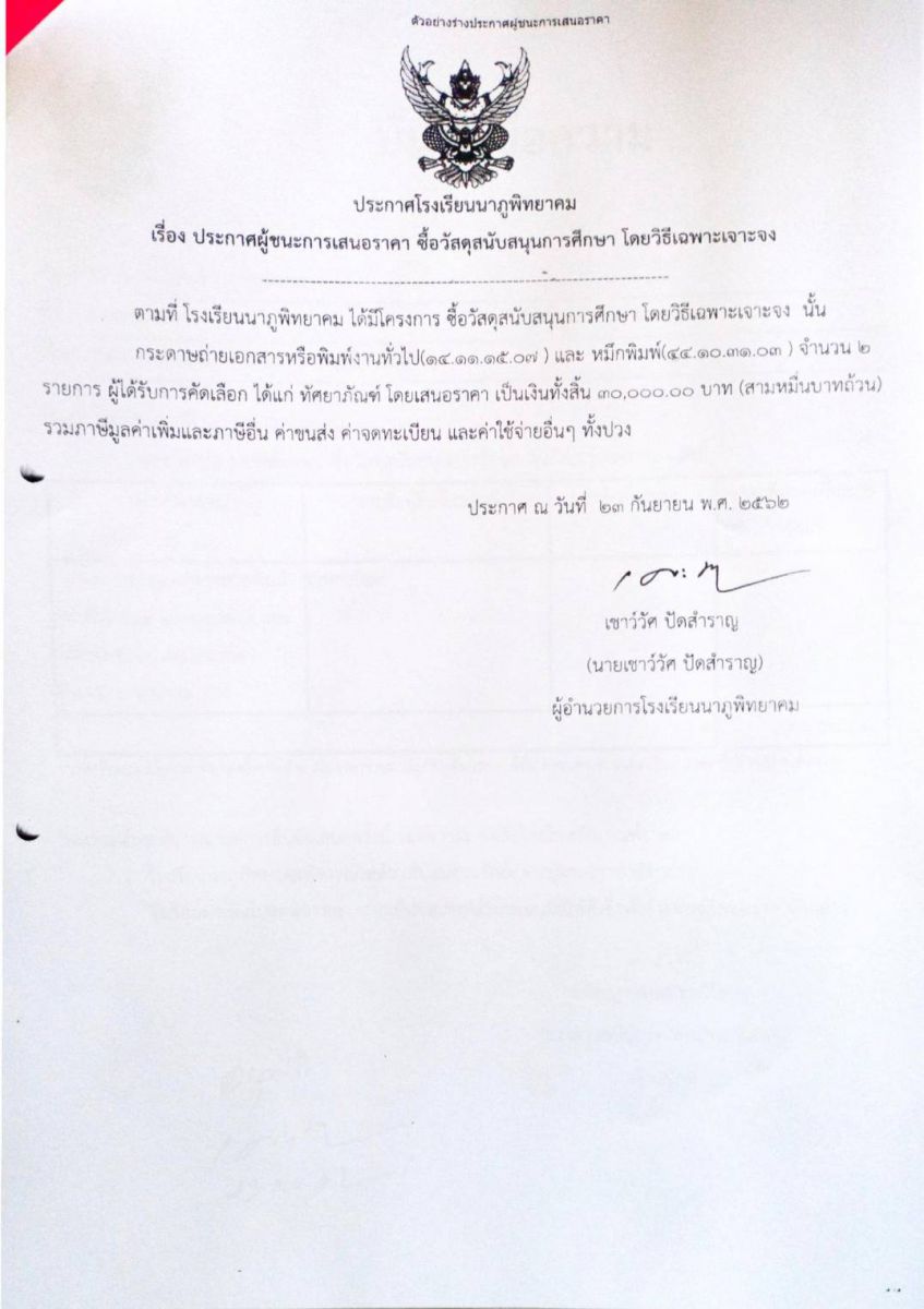 ประกาศผู้ชนะการเสนอราคา ซื้อวัสดุสนับสนุนการศึกษา โดยวิธีเฉาะเจาะจง
