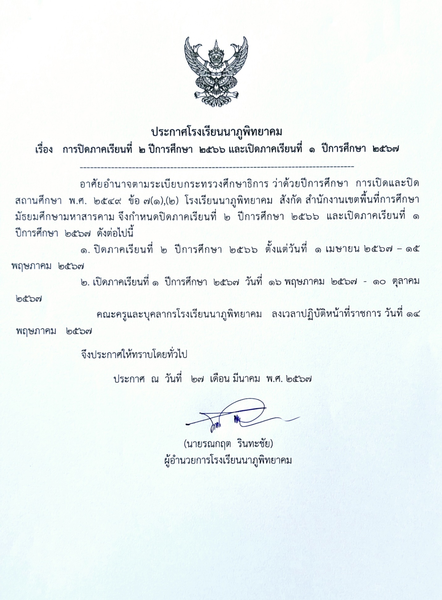 ประกาศ การปิดภาคเรียนที่ 2/2566 และเปิดภาคเรียนที่ 1/2567
