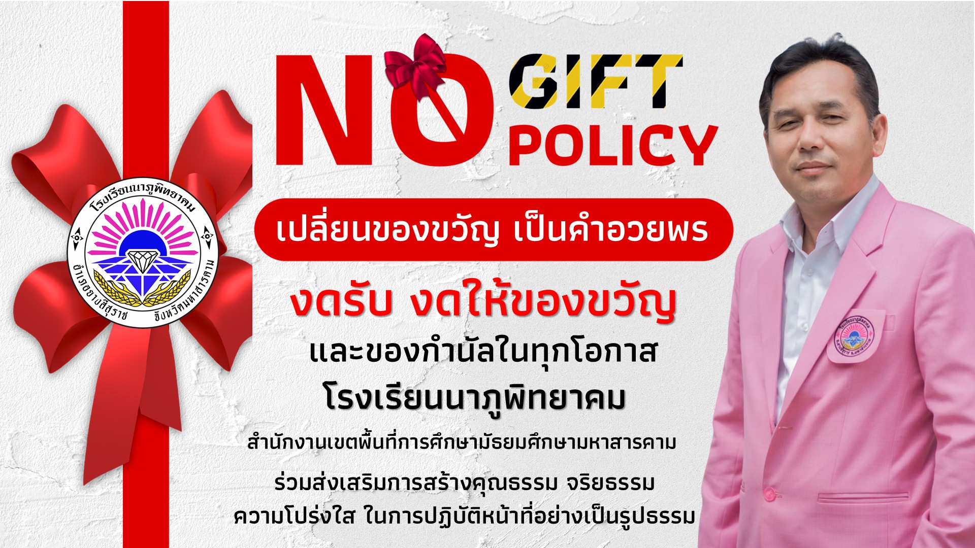 ผู้บริหารและคณะครู โรงเรียนนาภูพิทยาคม ขอประกาศเจตจำนงการเป็นองค์กรแห่งความโปร่งใส มีมาตรฐาน จริยธรรม งดรับของขวัญ ของกำนัลทุกชนิด รวมถึงผลประโยชน์อื่นใดจากการปฏิบัติหน้าที่