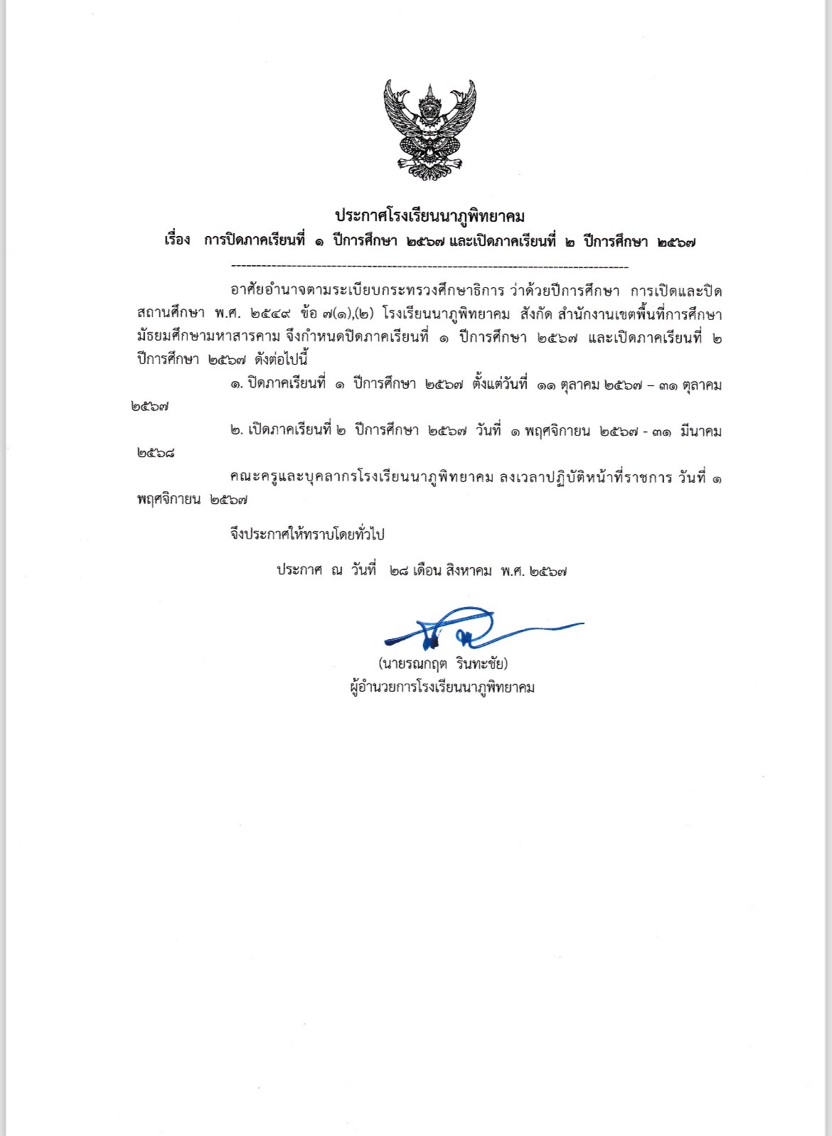 ประกาศการปิดภาเรียนที่ 1 และ เปิดภาคเรียนที่ 2 ปีการศึกษา 2567