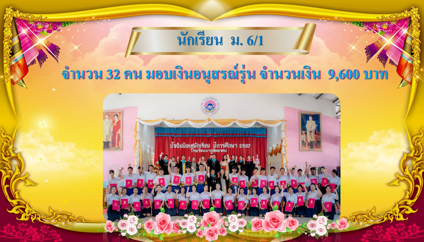 นักเรียนชั้นมัธยมศึกษาปีที่ 6/1 เพื่อจุดประสงค์ให้เป็นการสร้างอนุสรณ์รุ่น จำนวน 9,600 บาท
