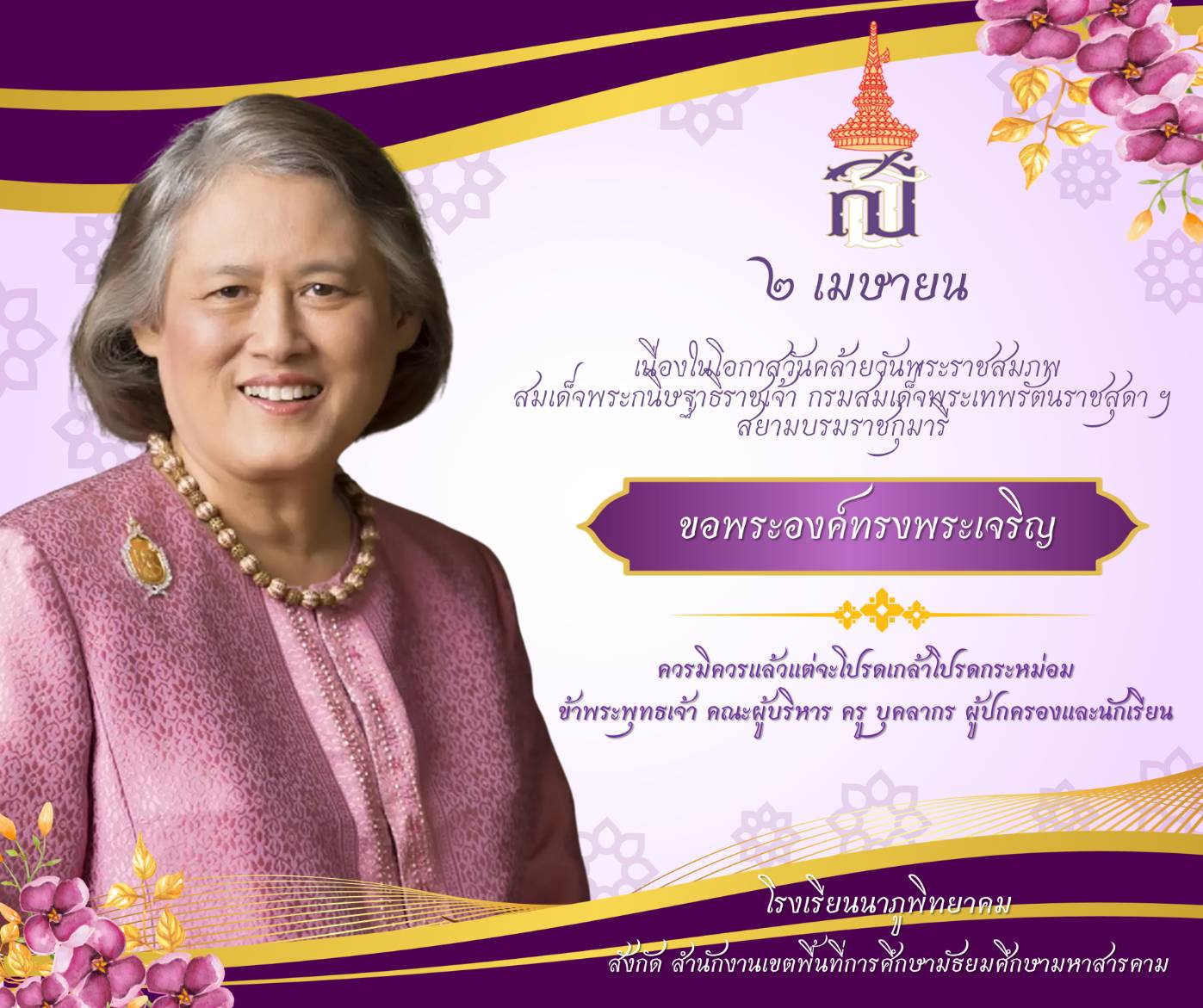 วันที่ 2 เมษายน เป็นวันคล้ายวันพระราชสมภพ สมเด็จพระกนิษฐาธิราชเจ้า กรมสมเด็จพระเทพรัตนราชสุดา ฯ สยามบรมราชกุมารี