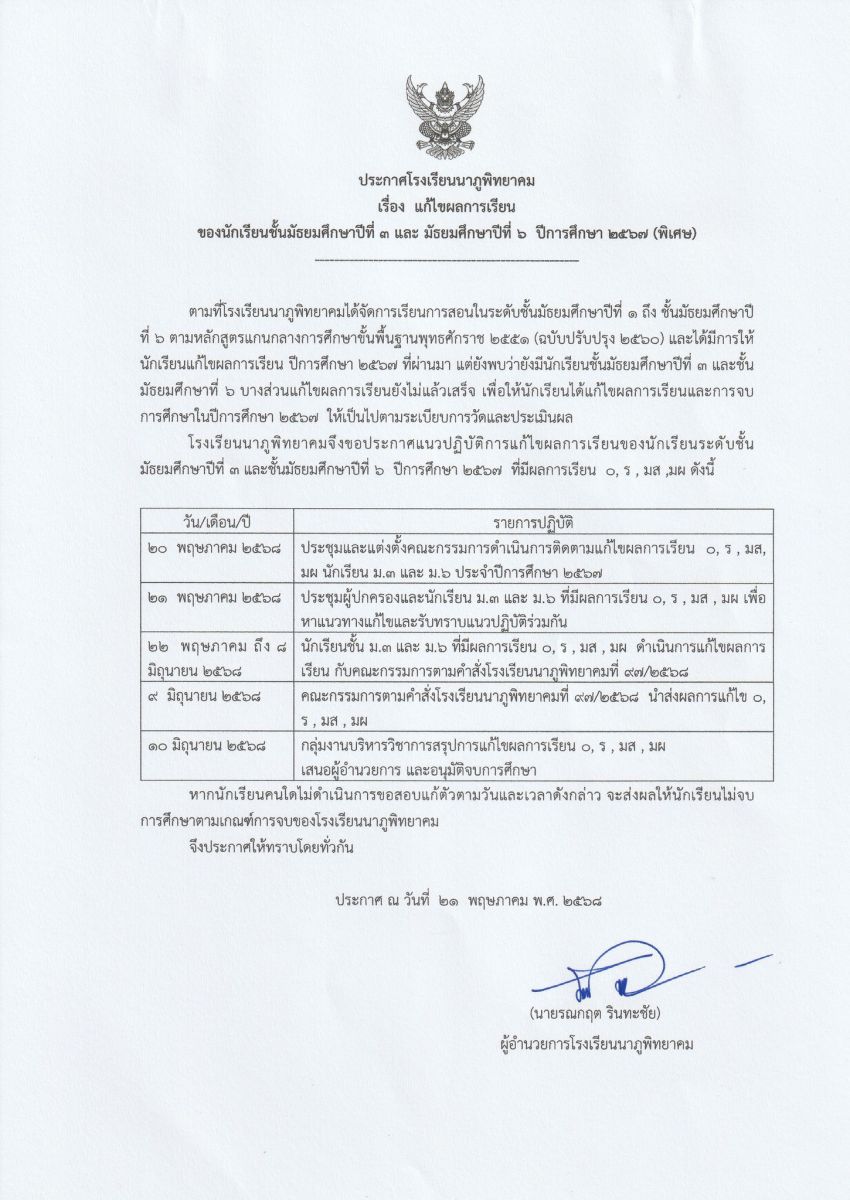 ประกาศแนวทางการแก้ไขผลการเรียนของนักเรียนชั้นมัธยมศึกษาปีที่ 3 และ 6 ปีการศึกษา 2567
