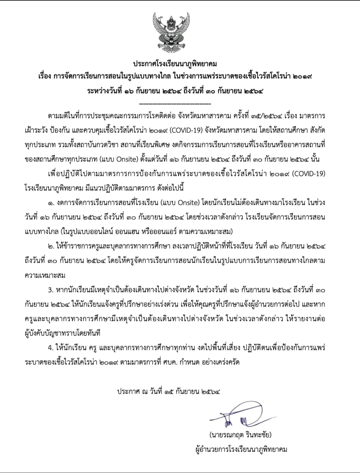 ประกาศเกี่ยวกับการจัดการเรียนการสอน ของโรงเรียนนาภูพิทยาคม ช่วงวันที่ 16 กันยายน 2564 ถึง 30 กันยายน 2564 ตามรายละเอียดดังนี้