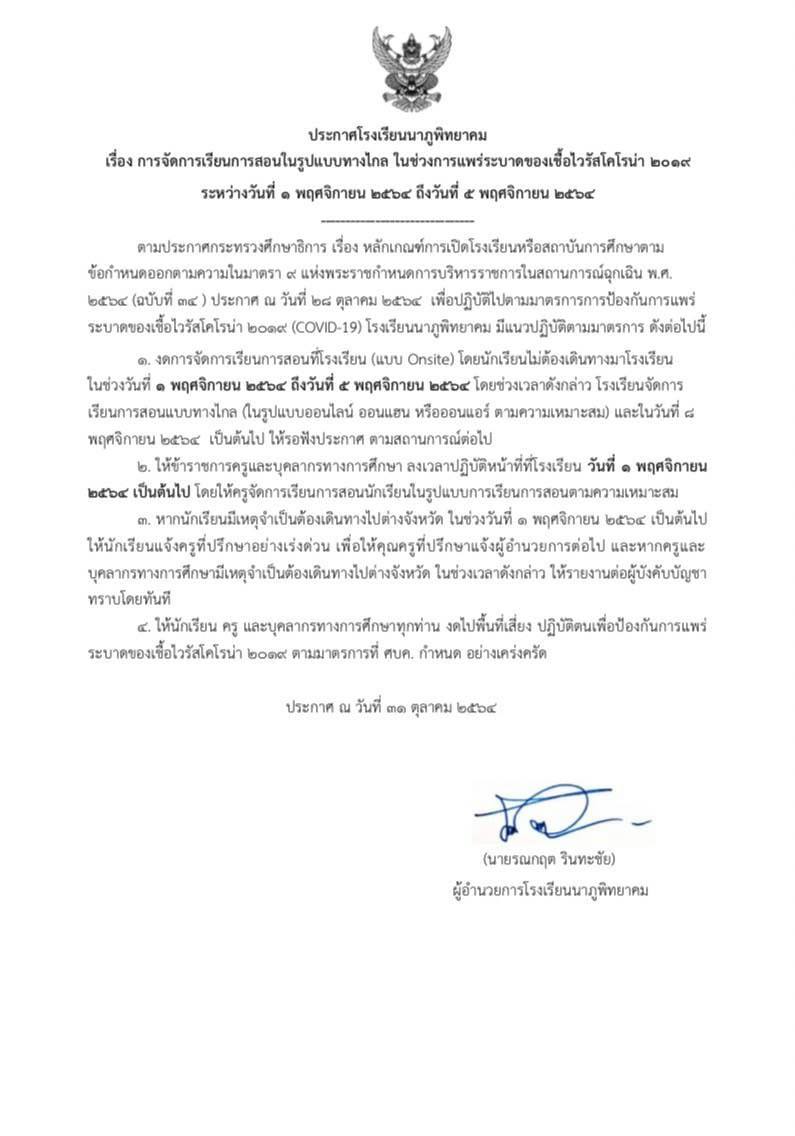 ประกาศโรงเรียนนาภูพิทยาคม เรื่อง การจัดการเรียนการสอนในรูปแบบทางไกล ในช่วงการแพร่ระบาดของเชื้อไวรัสโคโรน่า ๒๐๑๙ ระหว่างวันที่ ๑ พฤศจิกายน ๒๕๖๔ ถึงวันที่ ๕ พฤศจิกายน ๒๕๖๔