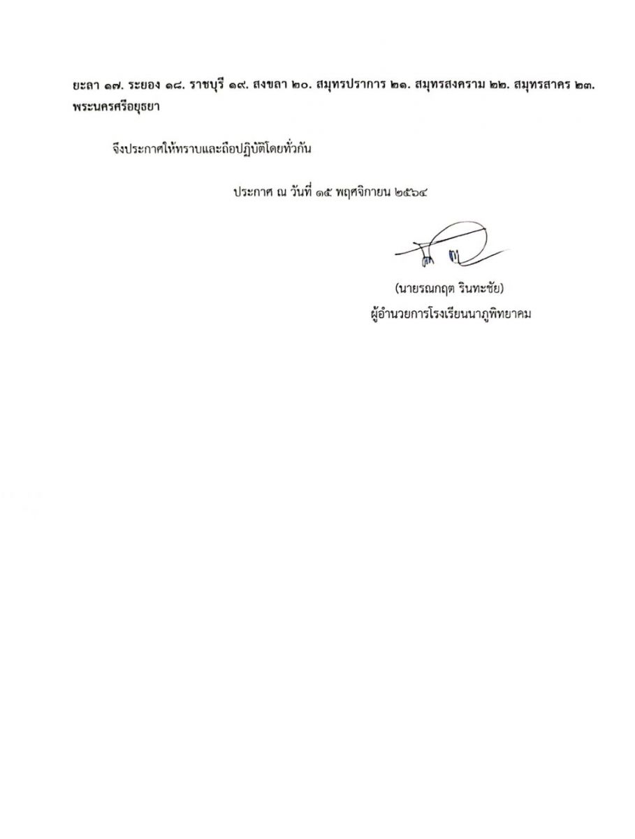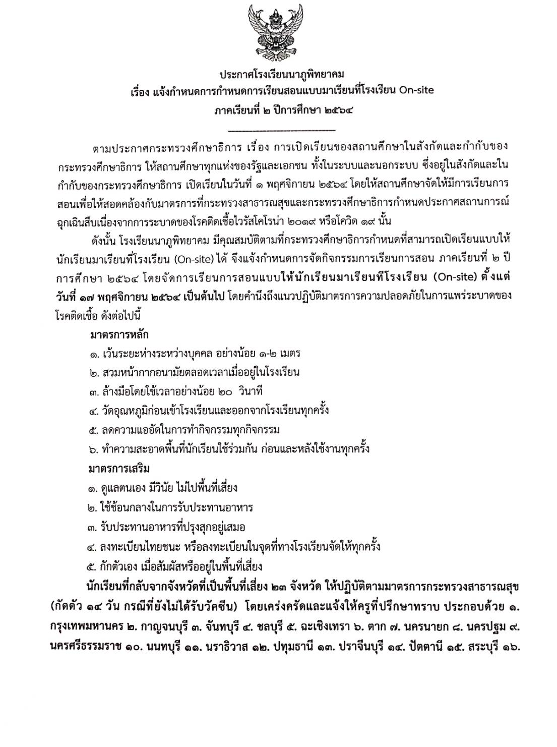 ประกาศโรงเรียนนาภูพิทยาคม เรื่อง แจ้งกำหนดการเรียนสอนแบบมาเรียนที่โรงเรียน On-site ประจำภาคเรียนที่ ๒/๒๕๖๔ ให้นักเรียนมาเรียนที่โรงเรียน (On-site) ตั้งแต่ วันที่ ๑๗ พฤศจิกายน ๒๕๖๔ เป็นต้นไป ตามรายละ