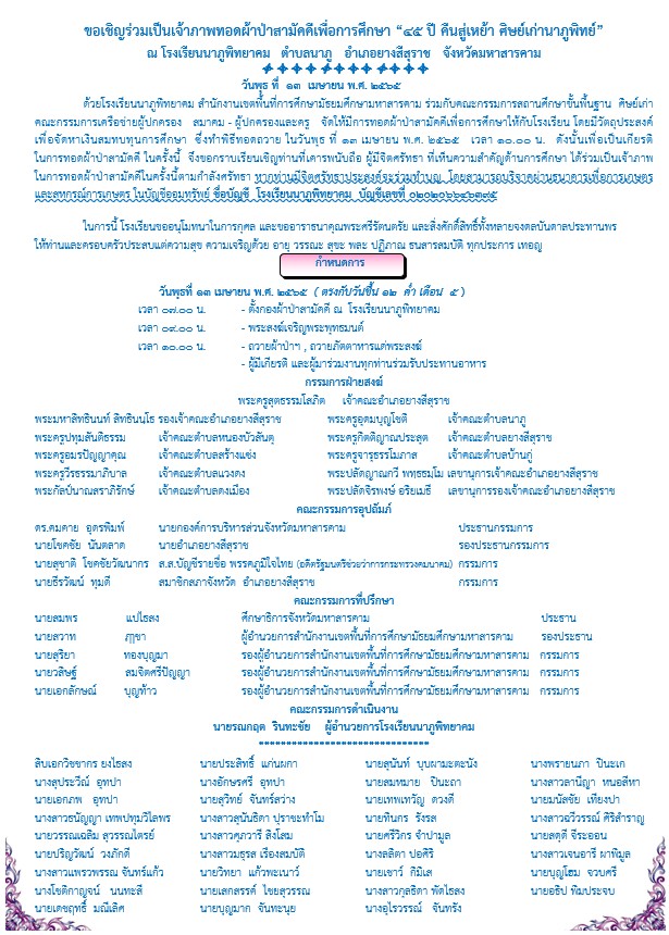 โรงเรียนนาภูพิทยาคม เชิญร่วมทอดผ้่าป่าการศึกษา เพื่อจัดตั้งกองทุนการศึกษาและช่วยเหลือนักเรียน