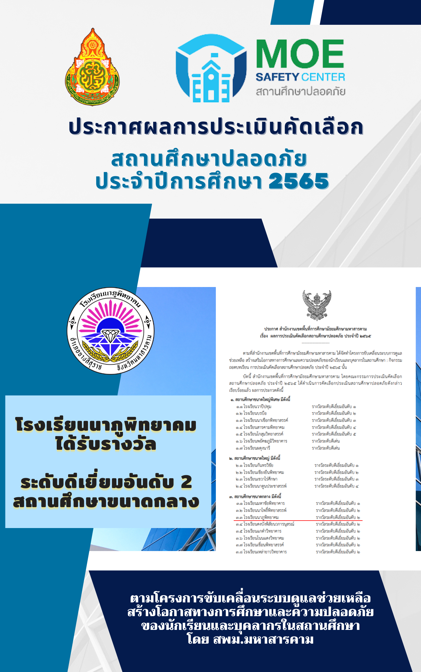 สำนักงานเขตพื้นที่การศึกษามัธยมศึกษามหาสารคาม โดยคณะกรรมการประเมินคัดเลือกสถานศึกษาปลอดภัย ประจำปี 2565 ได้ดำเนินการคัดเลือกประเมินสถานศึกษาปลอดภัย ผลการประเมินโรงเรียนนาภูพิทยาคม ได้รับรางวัล ระดับดีเยี่ยมอันดับ 2 ประเภทสถานศึกษาขนาดกลาง