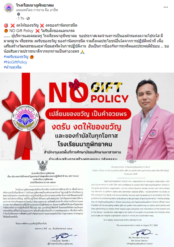 ประกาศเจตนารมณ์นโยบาย No Gift Policy จากการปฏิบัติหน้าที่